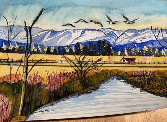Shawn and I went for a walk around the Munson Pond in January, 2025. The water was frozen. The Canadian Geese were flying and I captured this photo at the right time. There was a little snow on the mountains but no snow on the land. The shadows are long at this time of year. Watercolour by Courtenay Pitcher – 12 x 9. Cold Pressed. 140 lbs. $250.