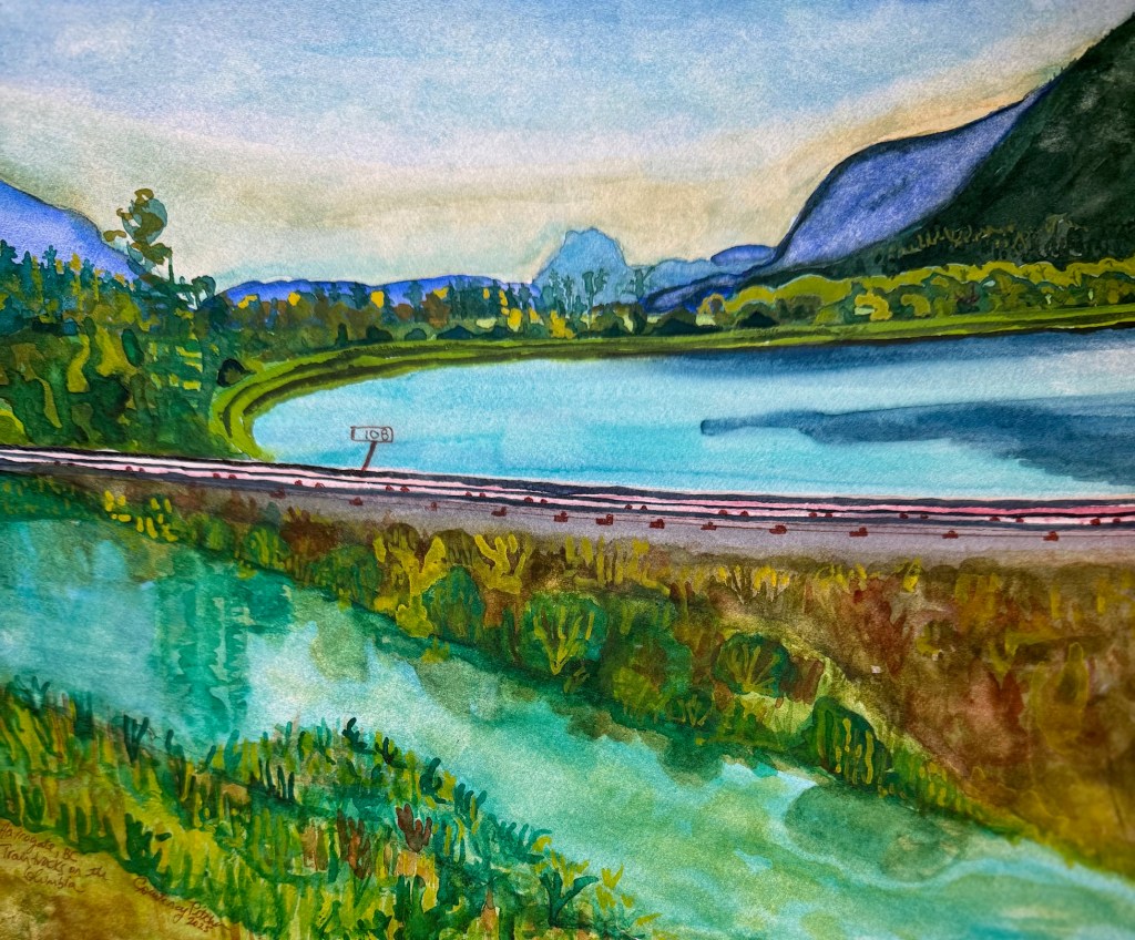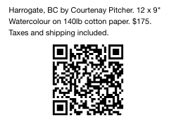 Harrogate, BC is located between Golden, BC and Radium Hot Springs, BC right on the Columbia River in the East Kootenay region. This is a painting of the railroad looking south towards Radium Hot Springs. I spent many summers in the area before the age of 16 and rode horseback with my cousin Candace. I have many fond memories of our summers together. 12″ x 9″ Watercolour on 140 lb paper. $175. by Courtenay Pitcher