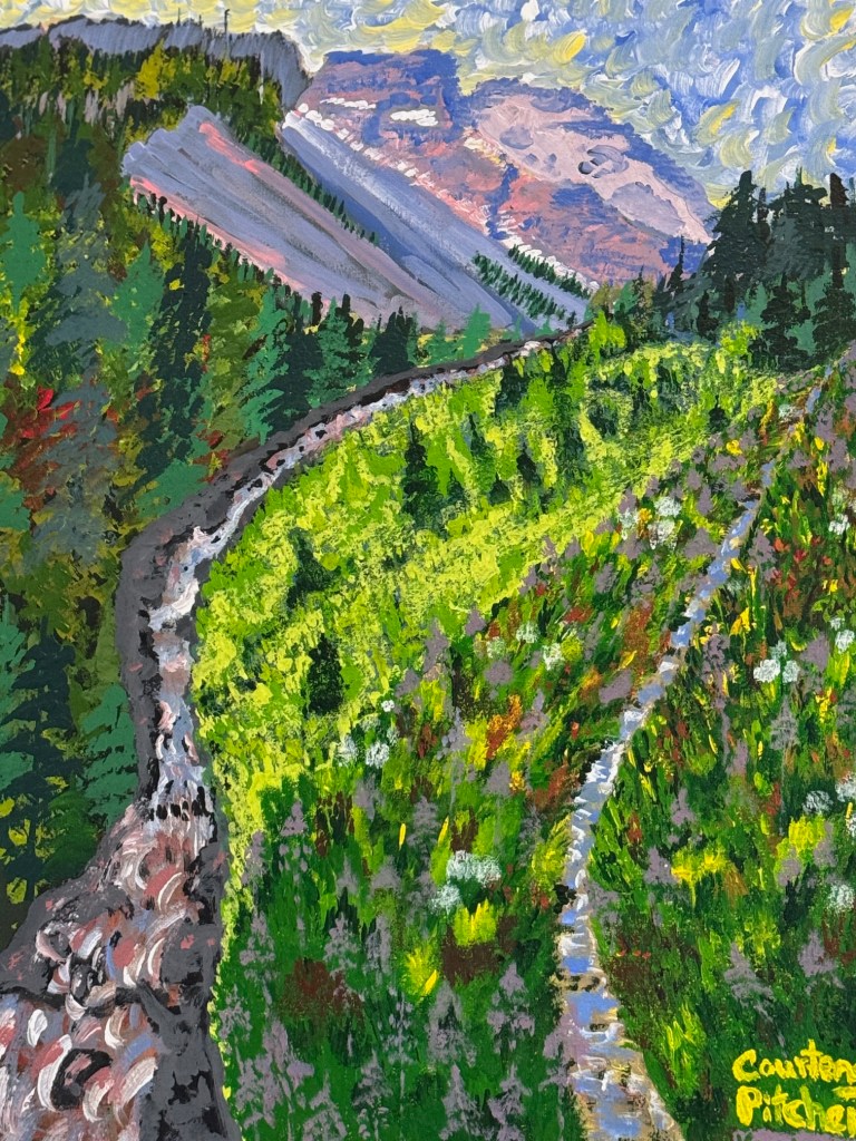 .75″ x 13.75 x 19.75″ Acrylic on Canvas on a wooden frame. by Courtenay Pitcher. Shawn and I hiked up Sinclair Creek to the base of the saddle of Mount Kindersley near Radium Hot Springs, BC in the summer of 2024. The hike was 3 hours up and 2 hours down. There was a bear in the area. We are lucky we didn’t get eaten.