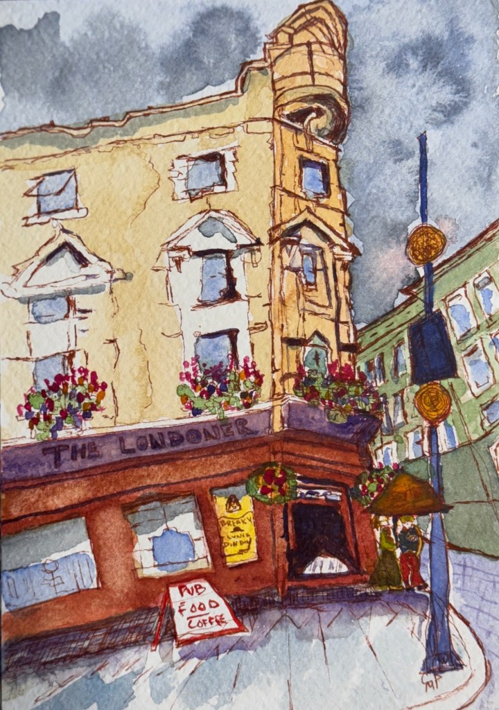 The Londoner A fictional pub somewhere in the United Kingdom. 5 x 7 on 140 lb watercolour and ink by Courtenay Pitcher. Share this: Click to share on Facebook (Opens in new window) Facebook Click to email a link to a friend (Opens in new window) Email Like Loading...