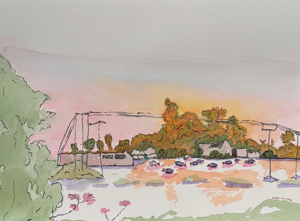 A field of sheep 12×9 watercolour by Courtenay Pitcher – a study of a field of sheep, a sunset and some electrical wires Share this: Share on Facebook (Opens in new window) Facebook Email a link to a friend (Opens in new window) Email Like Loading...