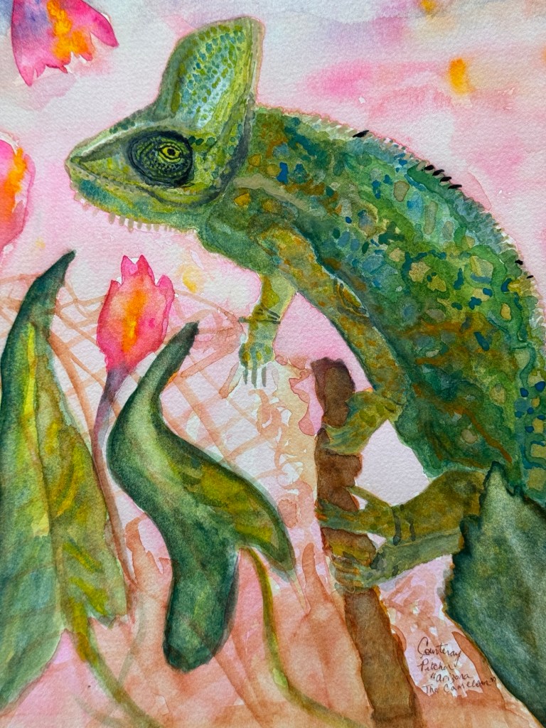 Arizona the Cameleon 12×9 original watercolour of Arizona the Cameleon by Courtenay Pitcher Share this: Share on Facebook (Opens in new window) Facebook Email a link to a friend (Opens in new window) Email Like Loading...