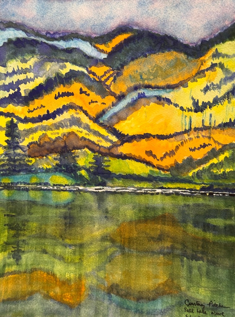 12×9 original watercolour by Courtenay Pitcher. On the 31a highway above Silverton, BC between Kaslo, BC you can see the most amazing fall scenery and calm lakes just before the road closes for the winter snow.