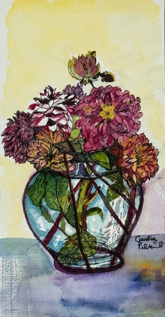 Dahlia’s from Dale 9 x 4.5 original ink and watercolour by Courtenay Pitcher Share this: Click to share on Facebook (Opens in new window) Facebook Click to email a link to a friend (Opens in new window) Email Like Loading...