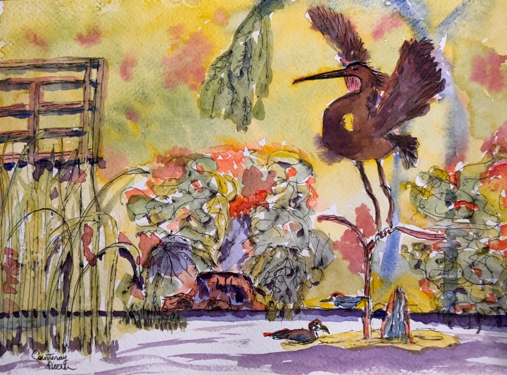 Brandt’s Creek Heron Sculpture 12×9 ink, gouache and watercolour by Courtenay Pitcher. This heron sculpture is located in downtown Kelowna in Brandt’s Creek. This was a beautiful Fall day painting alongside my mom. Share this: Share on Facebook (Opens in new window) Facebook Email a link to a friend (Opens in new window) Email Like Loading...
