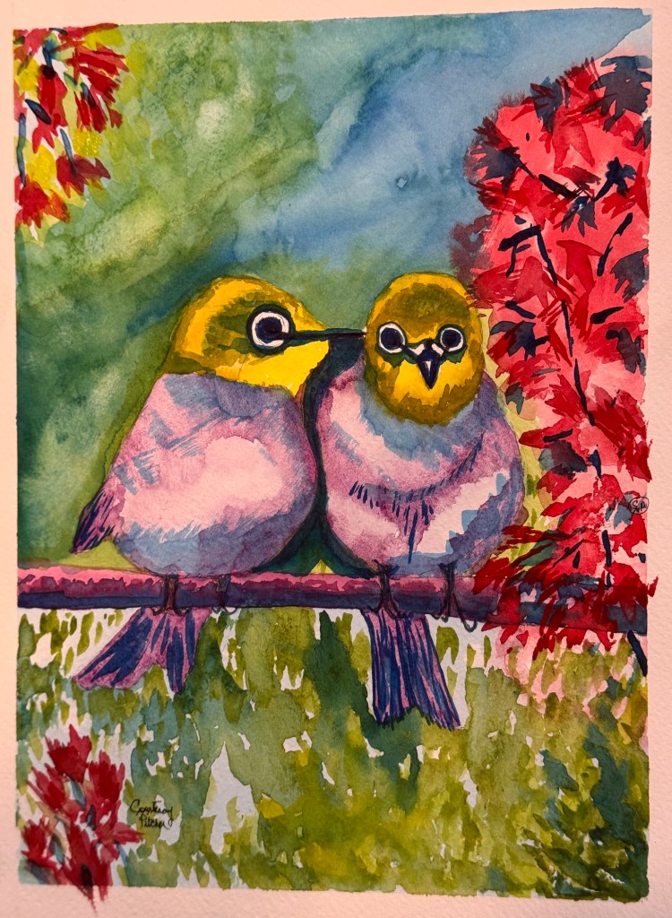 Love birds 12×9 watercolour by Courtenay Pitcher Share this: Click to share on Facebook (Opens in new window) Facebook Click to email a link to a friend (Opens in new window) Email Like Loading...