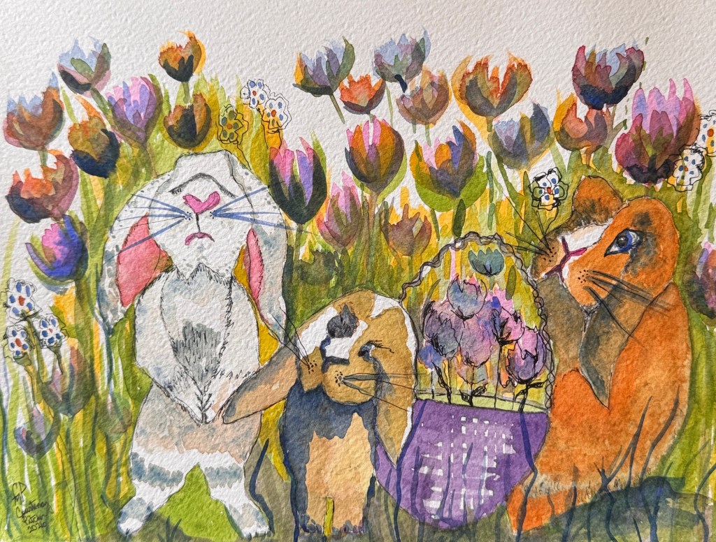 Easter bunnies and tulips 12×9 original composition by Courtenay Pitcher. Watercolour, ink. Share this: Share on Facebook (Opens in new window) Facebook Email a link to a friend (Opens in new window) Email Like Loading...